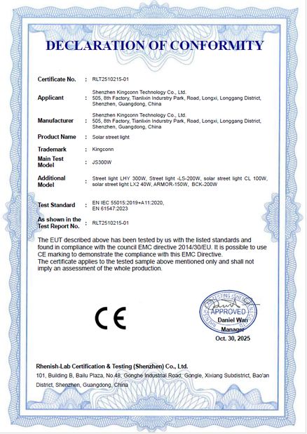As a professional manufacturer and seller of solar lighting fixtures, Shenzhen Kingconn Technology Co., Ltd has built a comprehensive Quality Control (QC) system. It has formed a 12-person professional QC team, all members of which have received training on international quality standards and hold certificates to work. The team covers specialized positions such as raw material inspection, in-production inspection, and final finished product inspection, building a solid defense line for product quality.